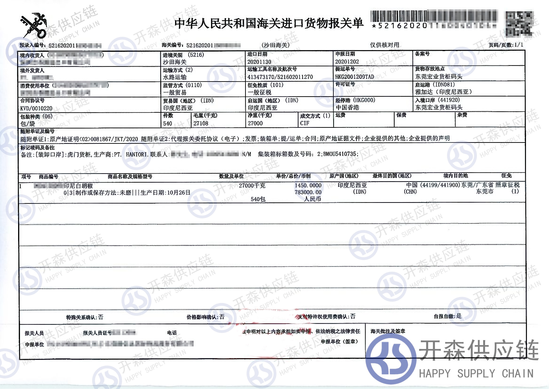 從印度尼西亞進(jìn)口一批胡椒到東莞碼頭,我司提供門到門進(jìn)口一站式清關(guān)服務(wù),開森擁有十余年農(nóng)副產(chǎn)品進(jìn)口清關(guān)經(jīng)驗(yàn)及案例,為客戶提供量身制作的進(jìn)口方案,讓客戶進(jìn)口省時(shí)省心省成本。